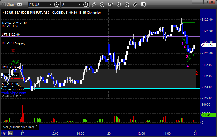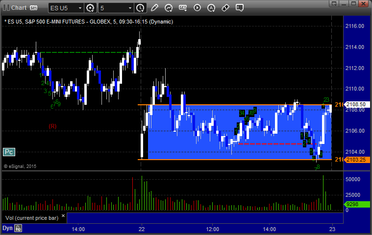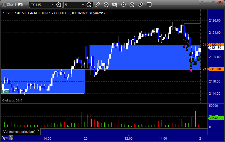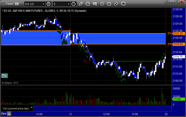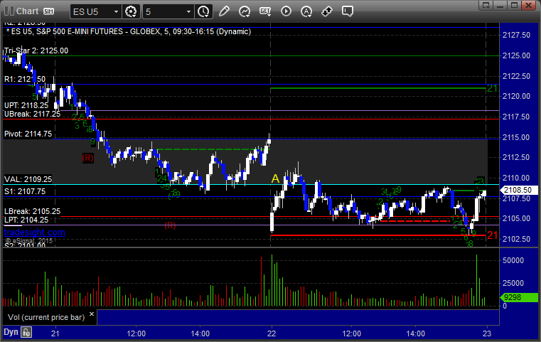 Mark's call triggered long at A at 2109.50 into the Value Area, hit first target for 6 ticks, stopped second half under the entry: