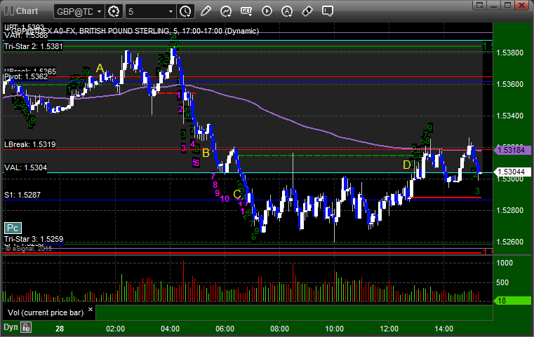 Triggered long at A and stopped. Triggered short at B, hit first target at C, stopped second half at D: