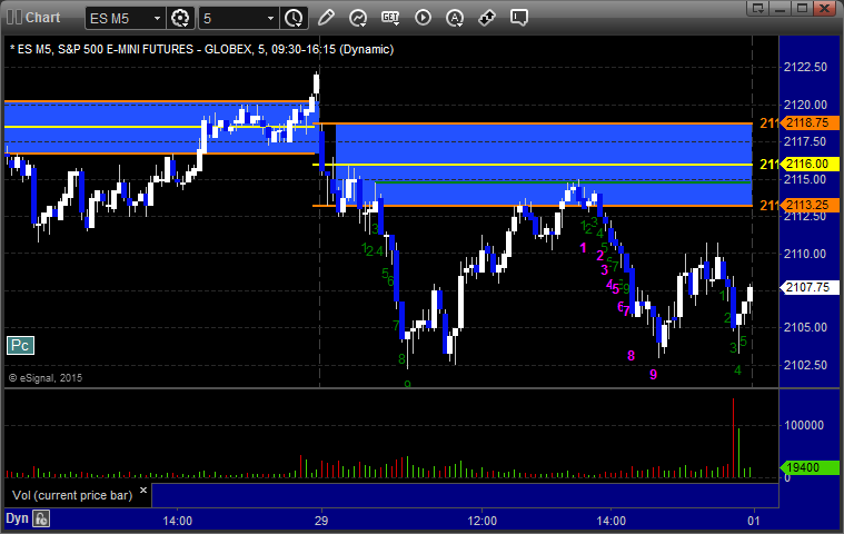 Another dull session on 1.6 billion shares (but BRCM buyout news added 100 million that wouldn't have been there otherwise). The markets gapped down and did very little. We reached up to fill the gap right at the close. Once again, the Opening Range plays were great and the main call stopped. See ES section below.