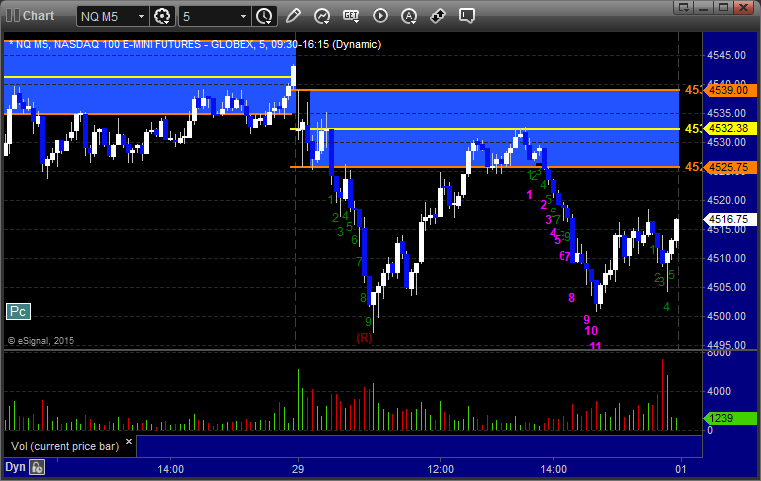 The markets gapped down and kept going, with most of the action in the first 45 minutes or so. NASDAQ volume closed at 1.5 billion shares. The Opening Range plays worked, although the ES trigger was too far outside of the OR to work, so I only did the NQ. See that section below. No official calls triggered.