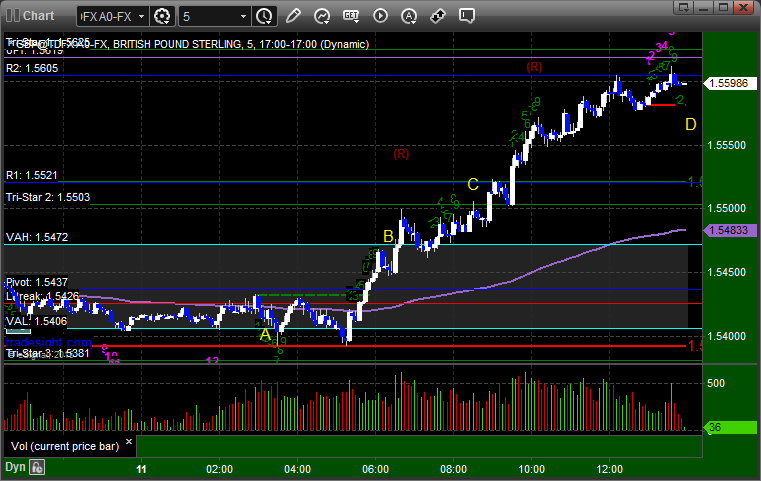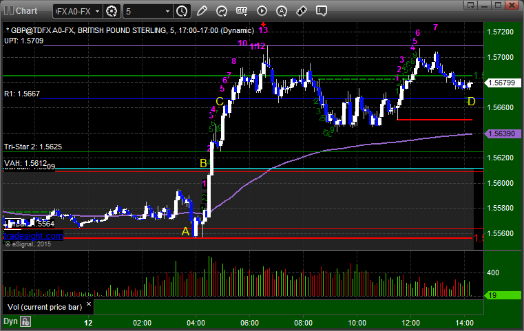 Triggered short at A and stopped. Triggered long at B, hit first target at C, still holding second half with a stop at D which is 100 pips in the money: