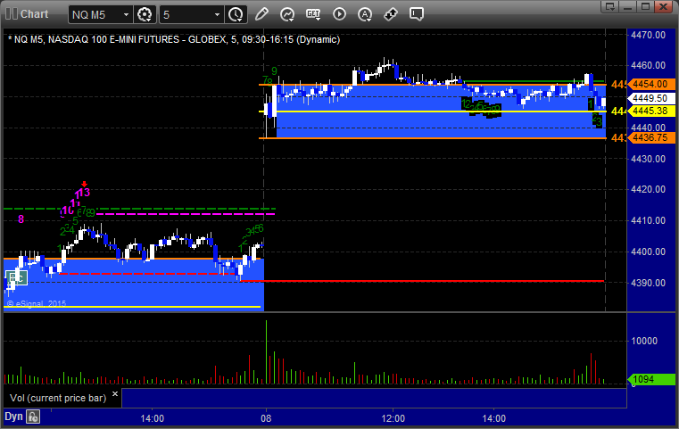 The markets gapped up in reaction to the NFP data and kept going a bit higher from there, and then went into Friday mode in the afternoon and closed at the VWAP on 1.8 billion NASDAQ shares. Mark accidentally posted his call in the Forex feed, so we won't count it even though it worked. Opening Range plays worked, see that section below.