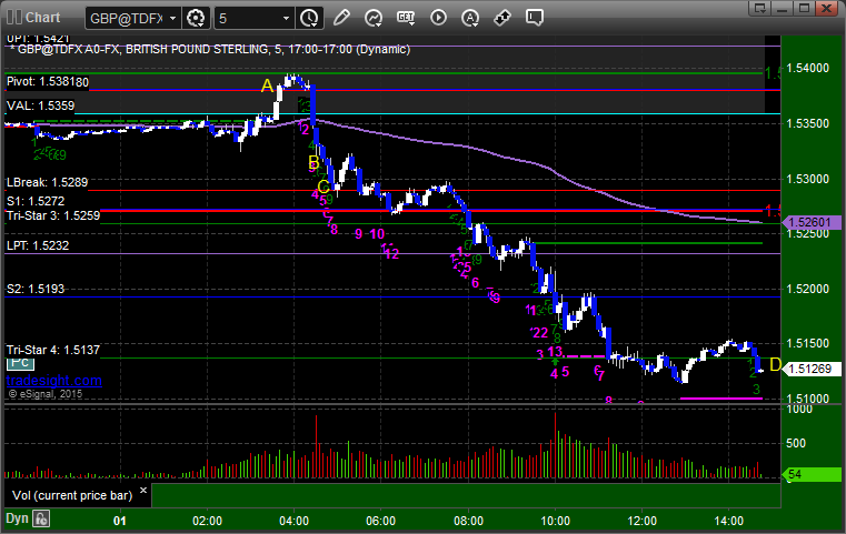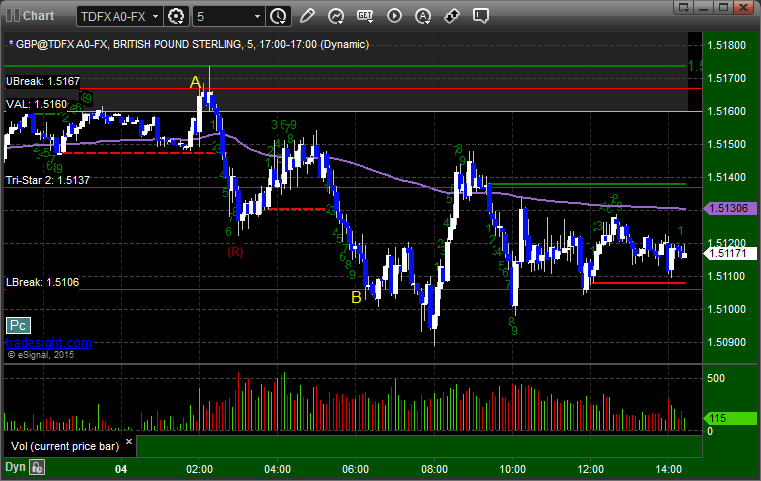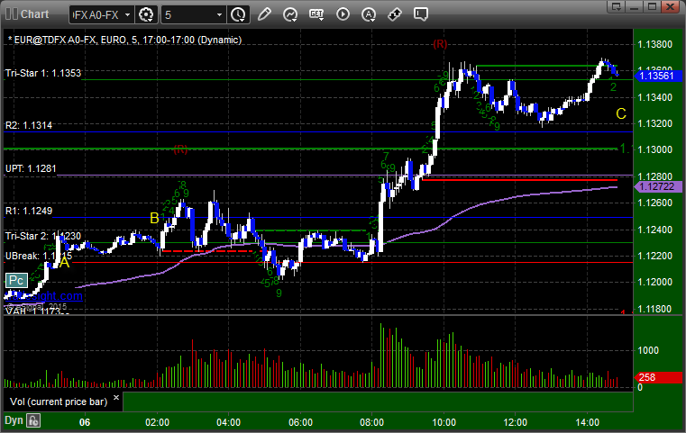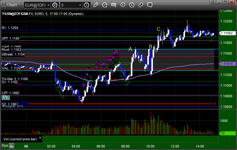 Came into the session long the second half of the prior day's trade from the 1.1170 area, and then the new trade triggered long at A, hit first target at B, and so we are holding pieces from both days with a stop at C: