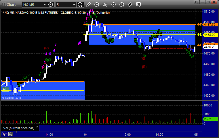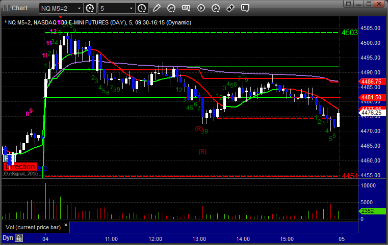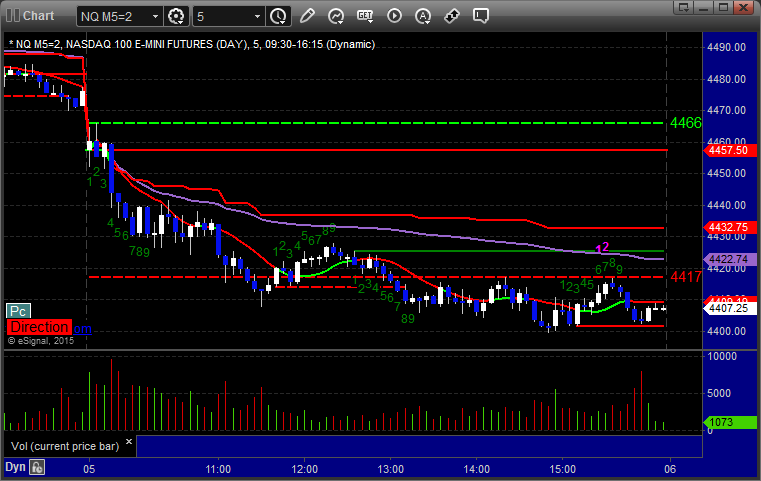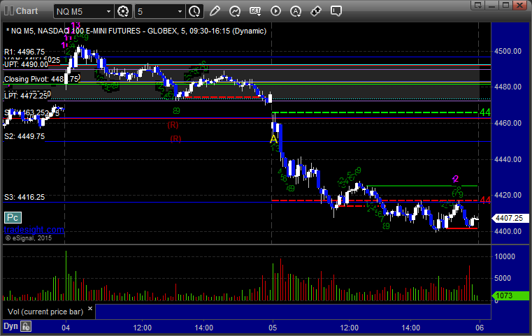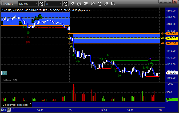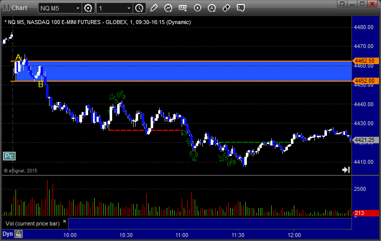 Mark's call triggered short at A at 4451.00, hit first target for 6 ticks, and he lowered the stop several times and stopped the final piece at 4439.00 for 24 ticks: