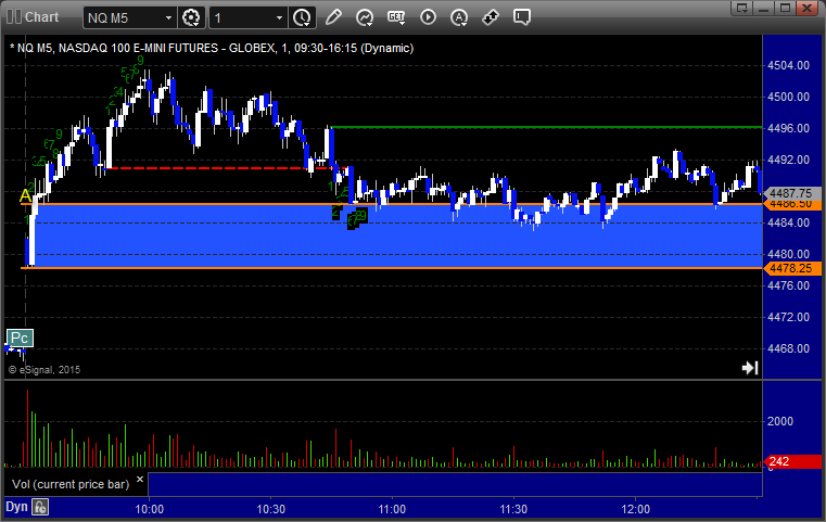 Horribly narrow range and dead action to start the week. We gapped up and closed around where we started on 1.5 billion NASDAQ shares. Our main trade call didn't trigger. We did, once again, have nice winners in the ES and NQ Opening Range Plays.