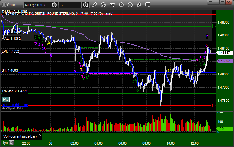 Triggered short at A, hit first target at B for almost 50 pips and stopped out of the second piece at the same level after a stop adjustment in the morning at C: