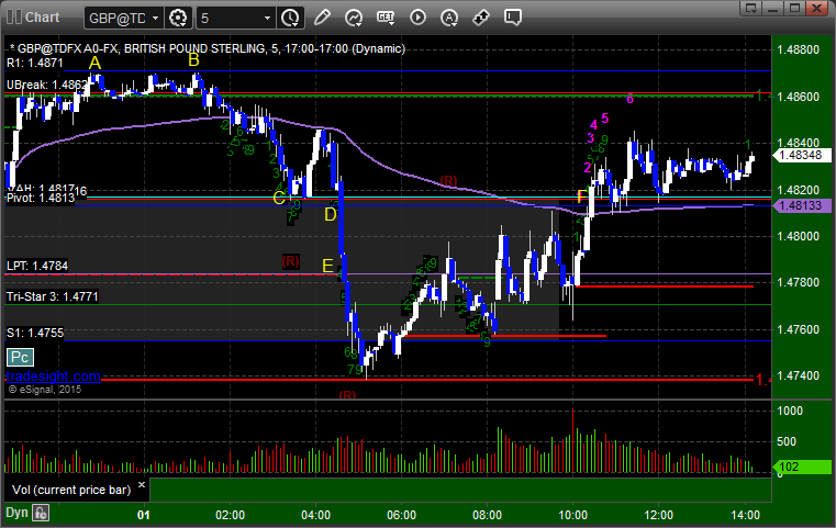 Used the R1 level perfectly to the pip at A and B (our trigger was above that), then came down and set our short trigger perfectly at C, then triggered at D, hit first target at E, and stopped second half at F in the morning: