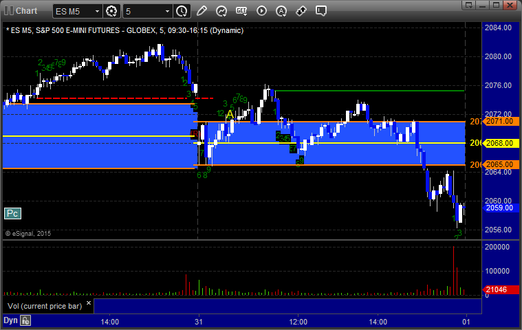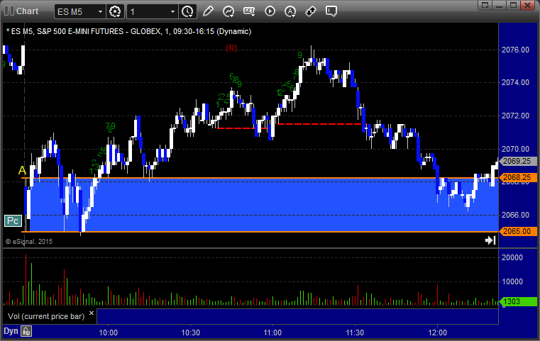 The markets gapped down, managed to reach up and exactly fill the ES gap on light volume, then stuck in narrow range until the last hour and then sold off lightly back toward Friday's closing gap on 1.5 billion NASDAQ shares. We had an NQ winner, plus see the Opening and Institutional Range sections below.
