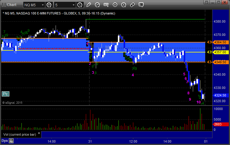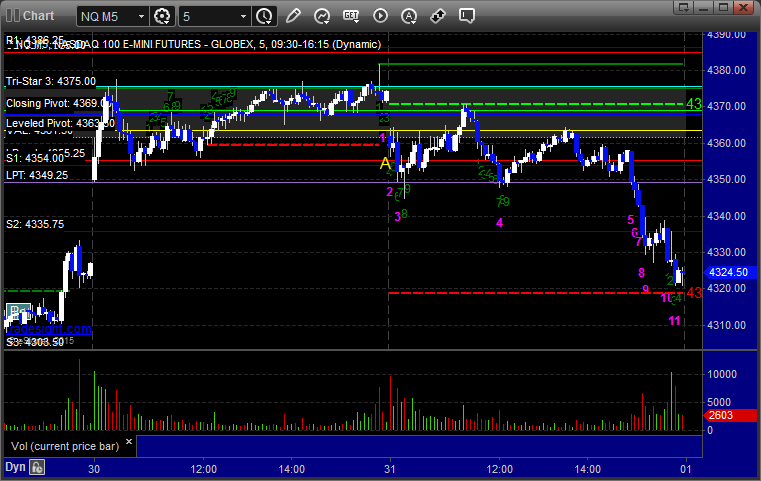 Don't have to make additional calls when the Opening Range plays work so well. I got 40 ticks to my final exit on both the ES and the NQ. See that section below. Meanwhile, to start the quarter, the markets opened flat and dropped out of the gate, then stabilized about 90 minutes in and went flat. Volume was 1.7 billion NASDAQ shares, which isn't spectacular.