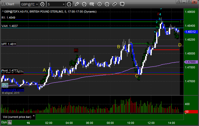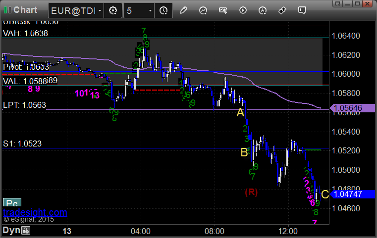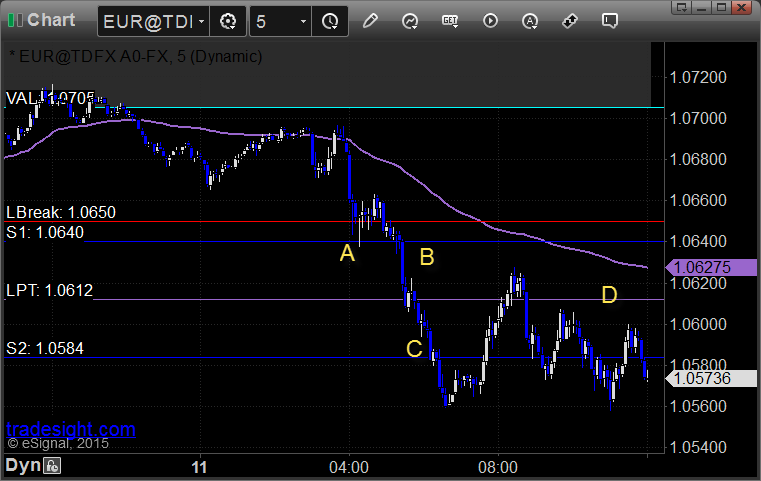 Triggered short at A, hit first target at B, closed second half at C for end of week for 85 pips: