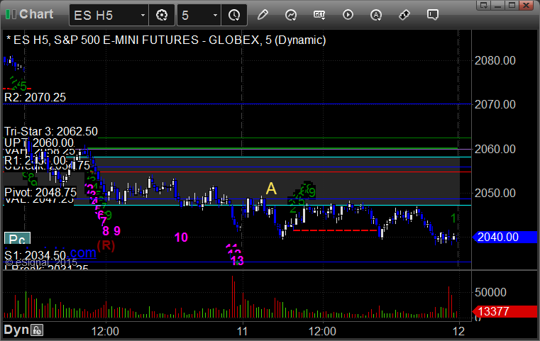 One loser after the ES set the Pivot nicely, but the Opening Range plays had better results. Overall, a fairly flat session in the markets with only 1.6 billion NASDAQ shares traded.