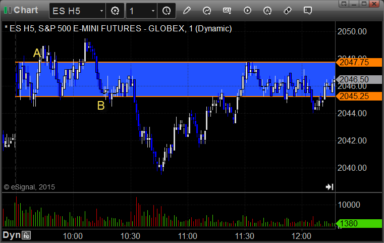 ES Opening Range Play triggered long at A and didn't, although you would have been in the NQ short at the time and we don't recommend going both directions. Triggered short at B and worked: