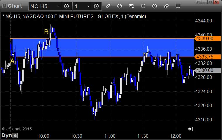 NQ Opening Range Play triggered short at A and worked, triggered long at B and didn't: