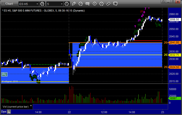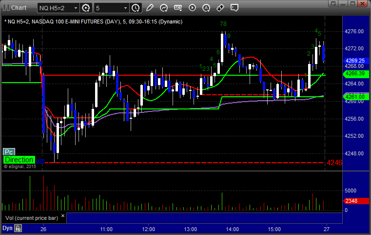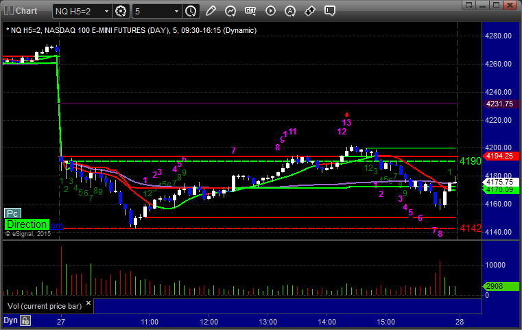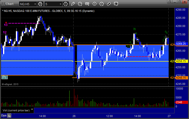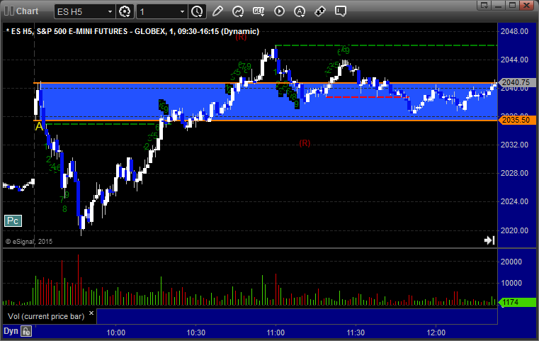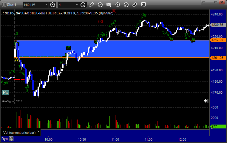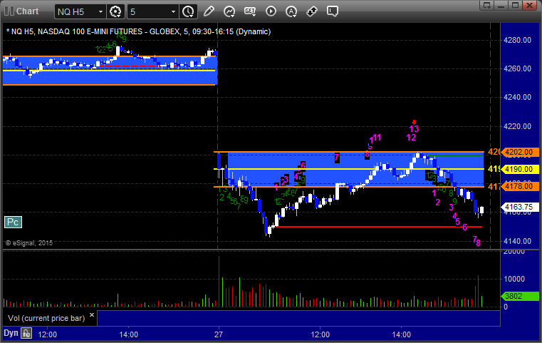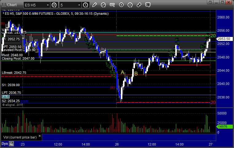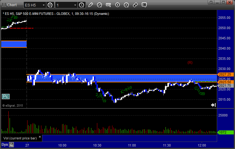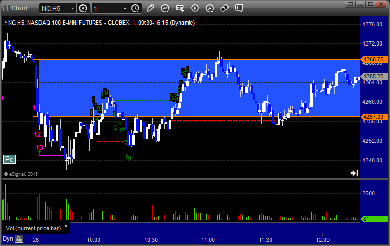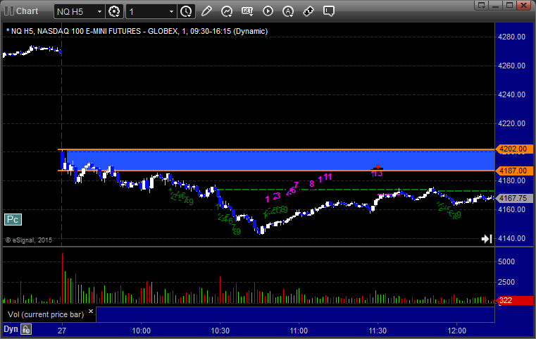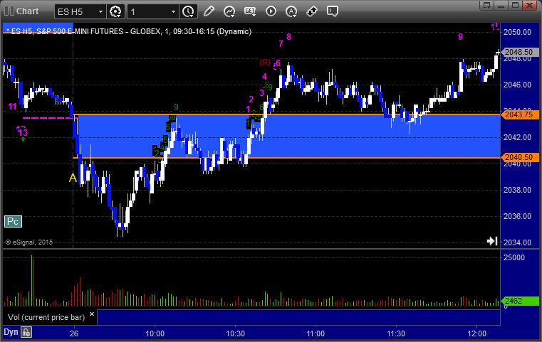 The markets moved lower early and then recovered, but we got a horrible volume number after the first hour due to the storm back East. The ES Opening Range play worked a little (see that section below) and then we had small gains on a separate ES call that stopped once and worked a second time. NASDAQ volume was only 1.5 billion shares and should be worse Tuesday with the storm really hitting overnight tonight.