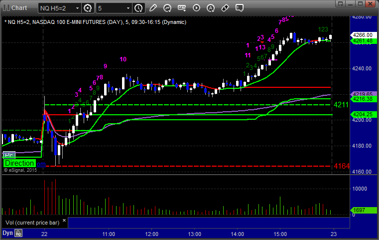 As usual, let's start by taking a look at the ES and NQ with our market directional lines, VWAP, and Comber on the 5-minute chart from today's session: