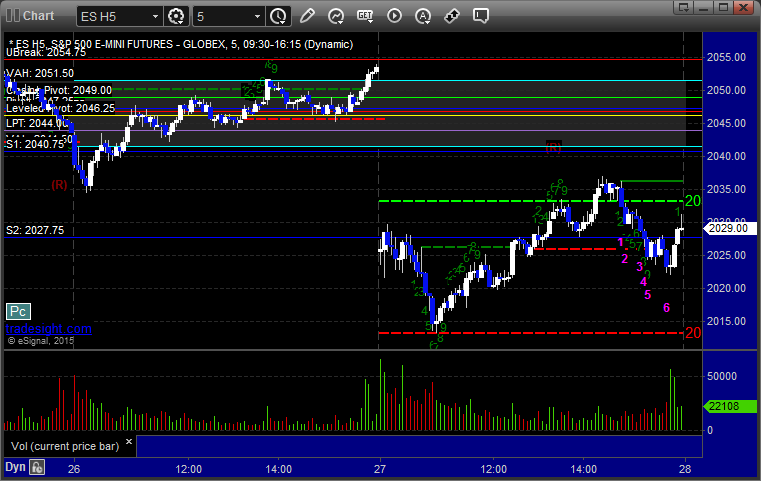 Triggered short at A at 2029.75 and hit first target for 6 ticks, lowered stop twice and stopped at 2026.25 for 14 ticks: