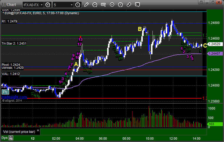 Triggered long at A, hit first target at B, raised stop twice and stopped second half at C for a nice gain:
