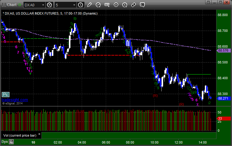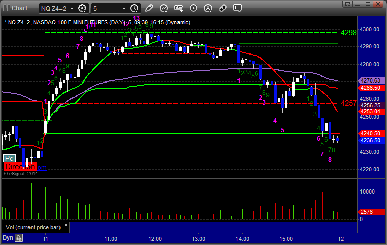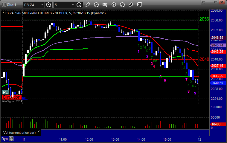 A very light volume session with a single stop out. See the ES section below. The markets gapped down and ended up not filling the gaps, heading lower after lunch on 1.4 billion NASDAQ shares.