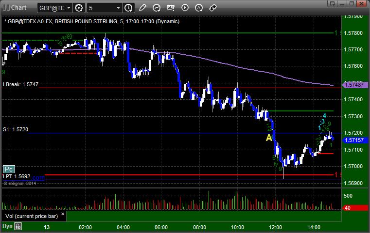Triggered short under S1 at A, got down to LPT but no further, came back up to test entry and ran out of time, so I closed it at end of chart: