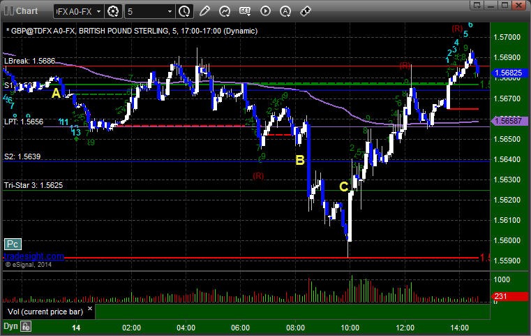 Triggered short at A, didn't quite stop, hit first target at B, lowered stop in the morning and stopped at C in the money: