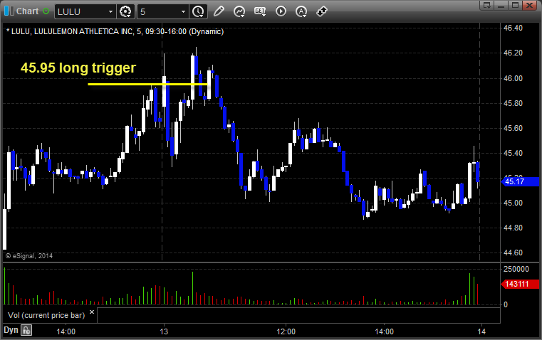 From the Messenger/Tradesight_st Twitter Feed, Rich's LULU triggered long (without market support due to opening 5 minutes) and didn't work: