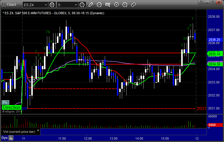 ES triggered short at A at 2034.00 and stopped. We did not put it back in as the market volume was poor and action was choppy:
