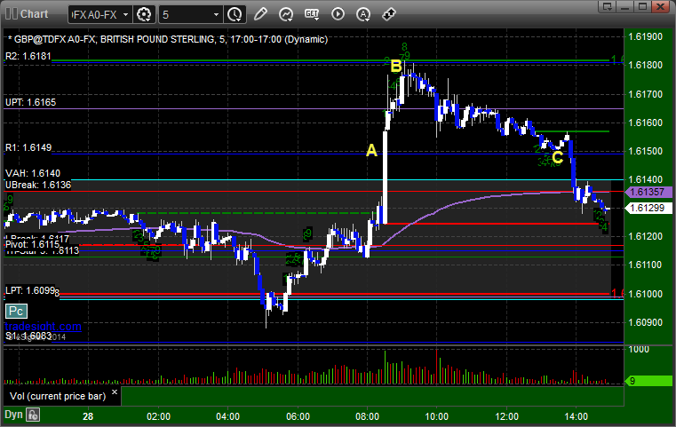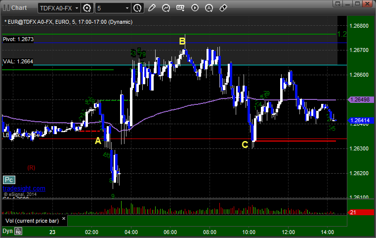 We triggered short at A, didn't hit first target, and stopped. Triggered part of our long at B (though not all three if you staggered) and stopped. Triggered short again for part of the trade (low bid was 1.26301 on MB) and stopped: