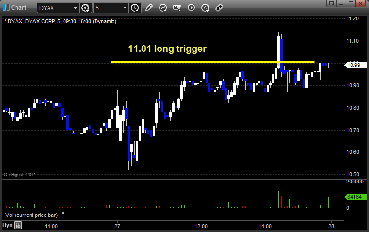 From the report, DYAX triggered long (with market support) and didn't go enough in either direction to count: