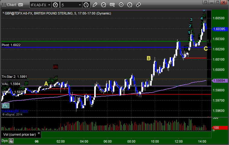 Triggered long at A, never stopped, hit first target at B, still holding the second half with a stop under the Pivot at C: