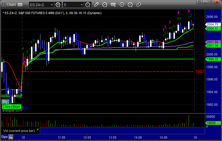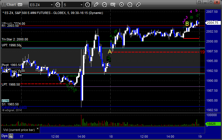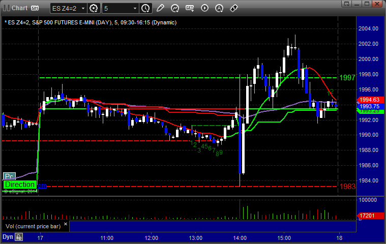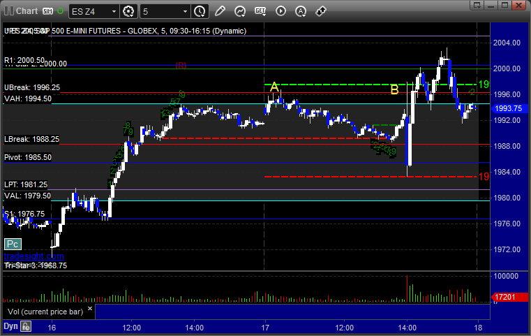 Mark's call triggered long at A at 1996.50 and stopped. It triggered again after the Fed, hit first target for 6 ticks, and stopped second half under the entry: