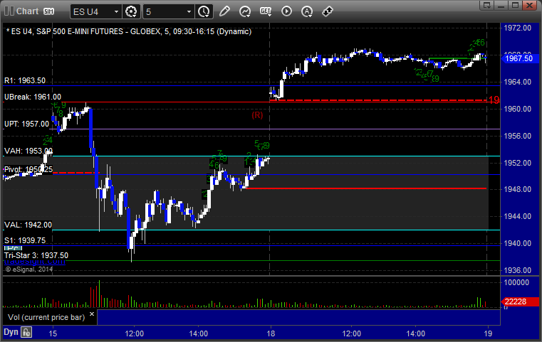 This could end up being the slowest week of the year with people on summer vacation. The markets gapped up to start the week, and the ES broke through R1 and never touched another level. The last 5 hours of the day traded in a 3 point ES range. NASDAQ volume closed at 1.2 billion shares.