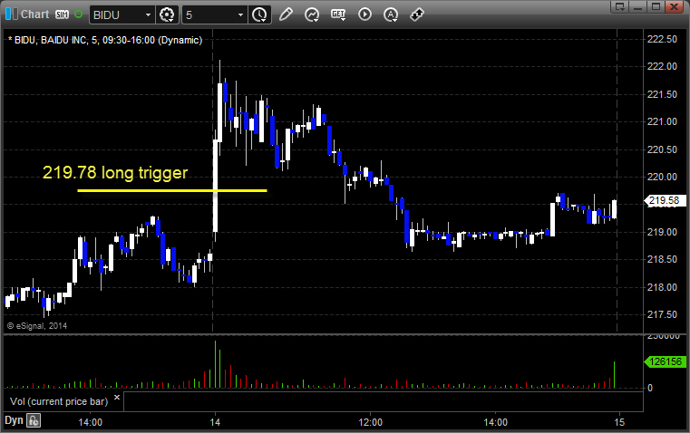 From the Messenger/Tradesight_st Twitter Feed, BIDU triggered long (without market support due to opening 5 minutes) and worked: