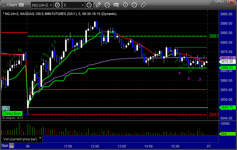 We gapped down and got some Value Area plays, with the ES call in particular working a bit. Ultimately crossed the Value Area and could have made more, but our stop was raised and got hit. NASDAQ volume closed at 1.7 billion and the markets closed fairly flat.