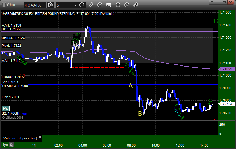 Our long triggered at A at 3931.50 and didn't quite make it to the first target and stopped. Our short triggered at B at 3926.00, hit first target for 6 ticks, and stopped second half over entry: