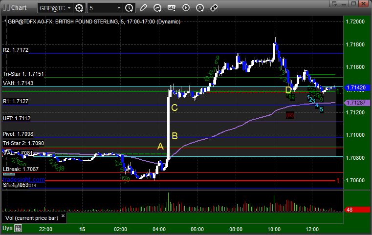 The second half of the short from the prior session stopped at A in the money. Our new long triggered long at B, hit first target at C, and we raised the stop twice and stopped at D for 40 pips: