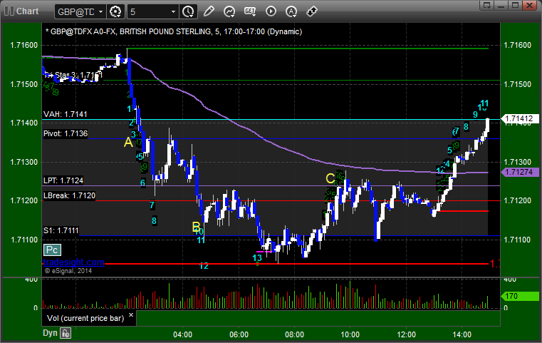 Triggered short at A, hit first target at B, lowered stop in the morning and stopped the second half over the LPT at C: