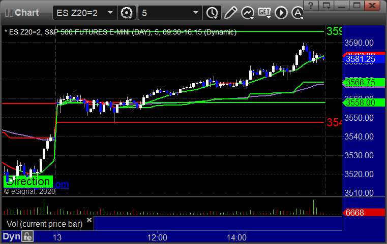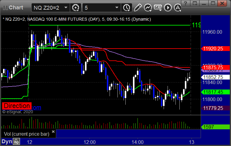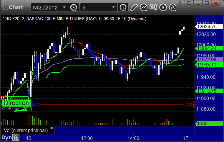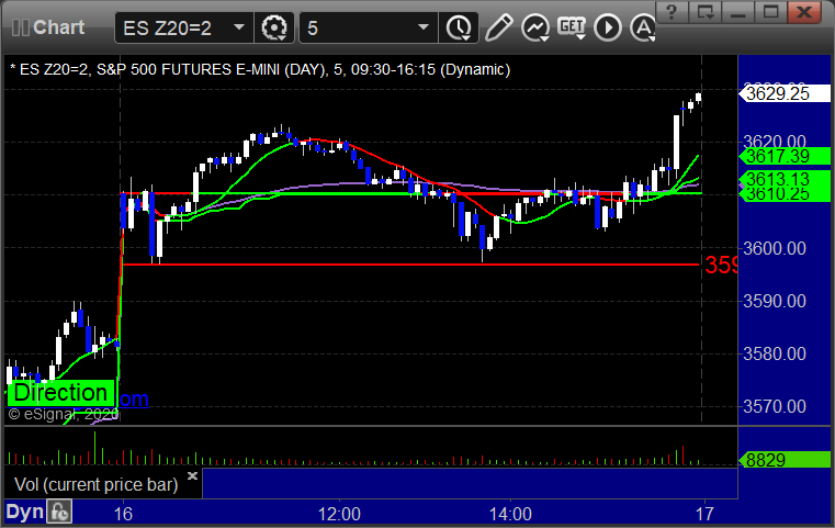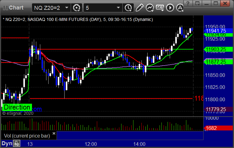 As usual, let's start by taking a look at the ES and NQ with our market directional lines, VWAP, and Comber on the 5-minute chart from today's session: