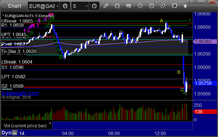 Triggered long at A and stopped. Triggered short at B, hit first target at C, still holding second half with a stop over S1: