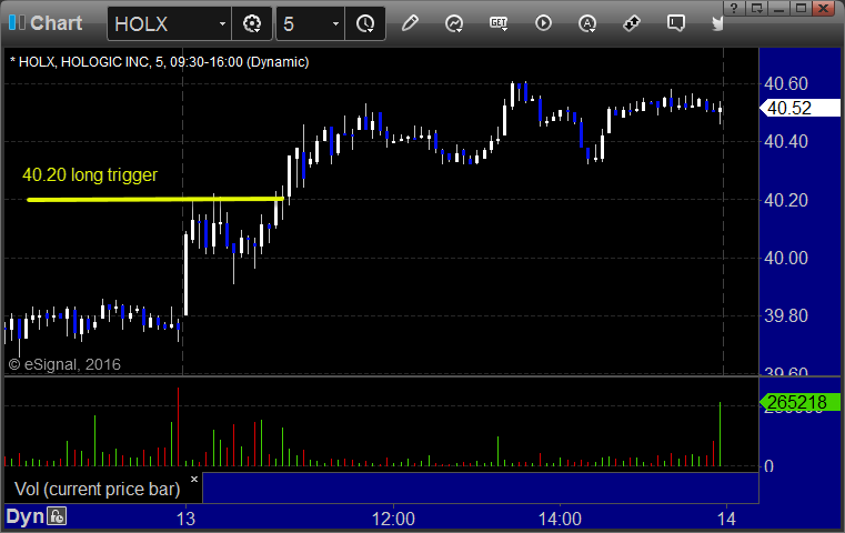 From the report, HOLX triggered long (with market support) and worked, I did not stick with it because it took so long: