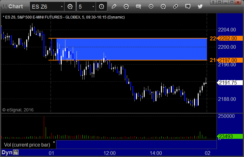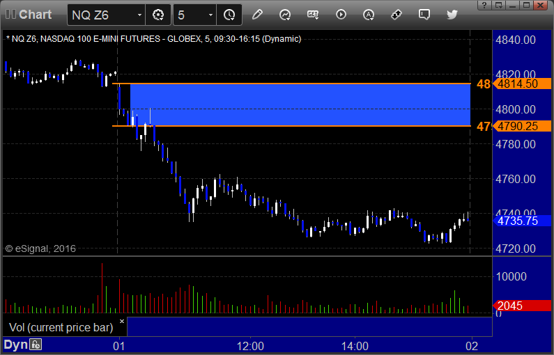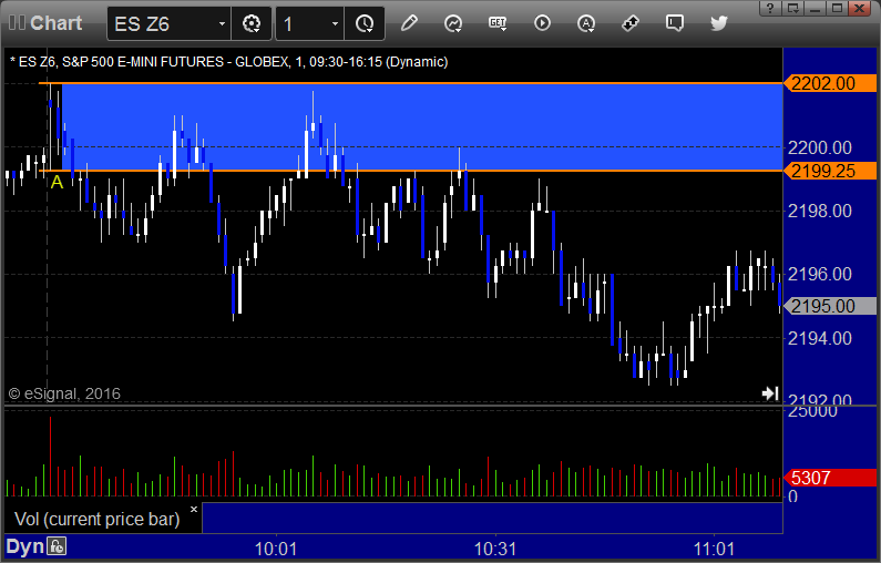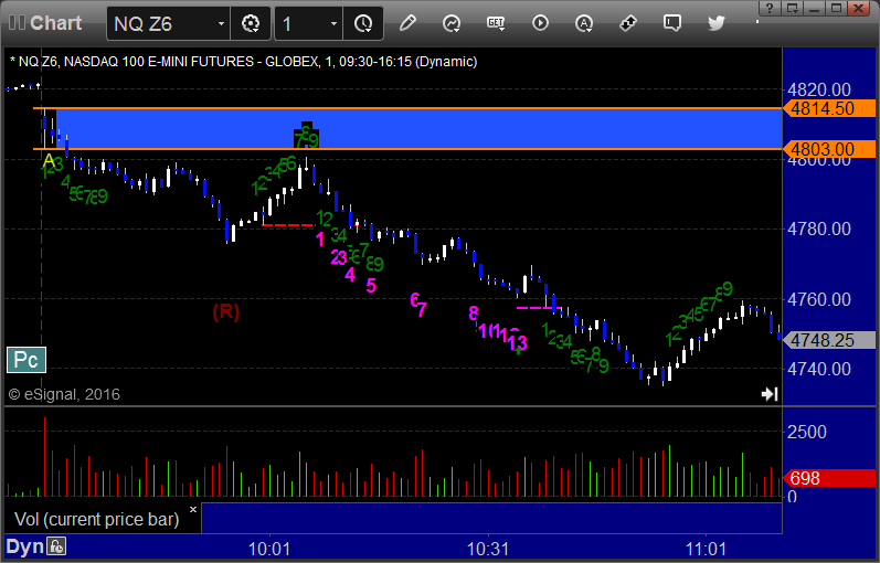 The markets opened close to flat and the ES drifted lower but the NASDAQ side sold off more solidly. Volume was improved to 2.0 billion NASDAQ shares as the sell-off picked up speed. Opening Range plays worked.