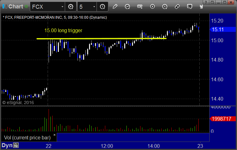 From the Messenger/Tradesight_st Twitter Feed, Rich's FCX triggered long (without market support) and didn't do much: