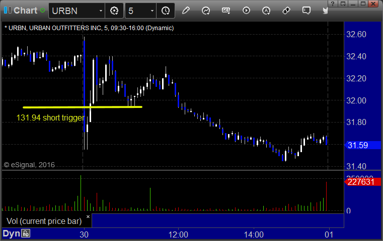 From the report, URBN triggered short (without market support due to opening 5 minutes) and worked enough for a partial, but you shouldn't really have been in it moving like that in the opening 5: