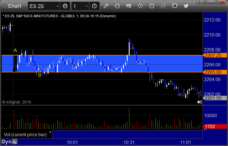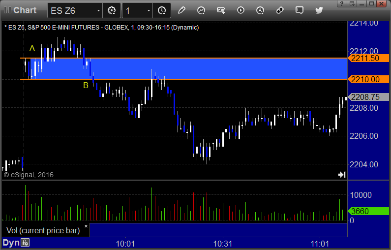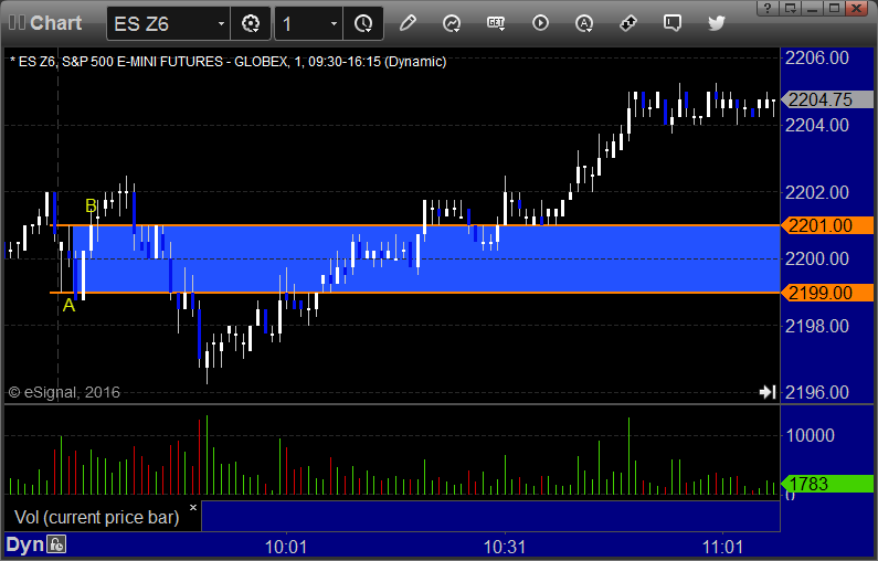 ES Opening Range Play triggered long at A and stopped, triggered short at B and stopped:
