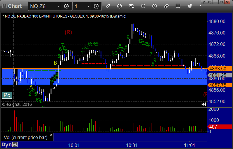 NQ Opening Range Play triggered short at A and worked enough for a partial, triggered long at B and worked: