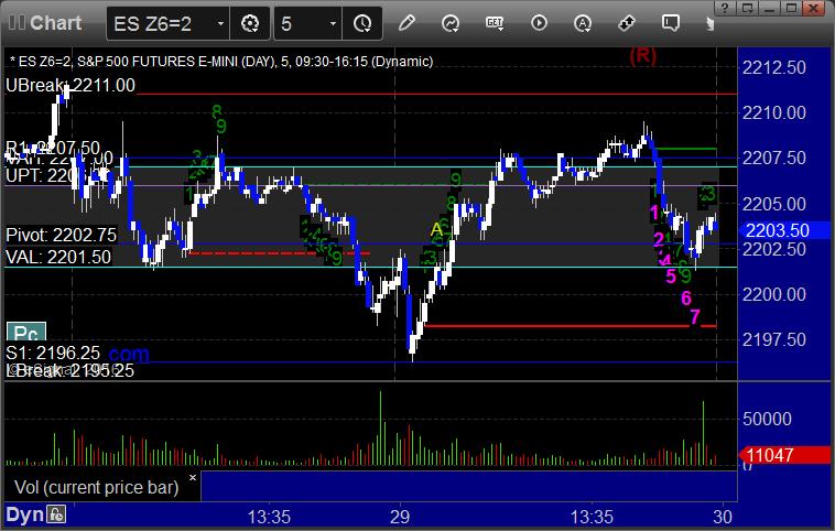 My call triggered long at A at 2203.00, hit first target for 6 ticks, and stopped second half 3 ticks in the money: