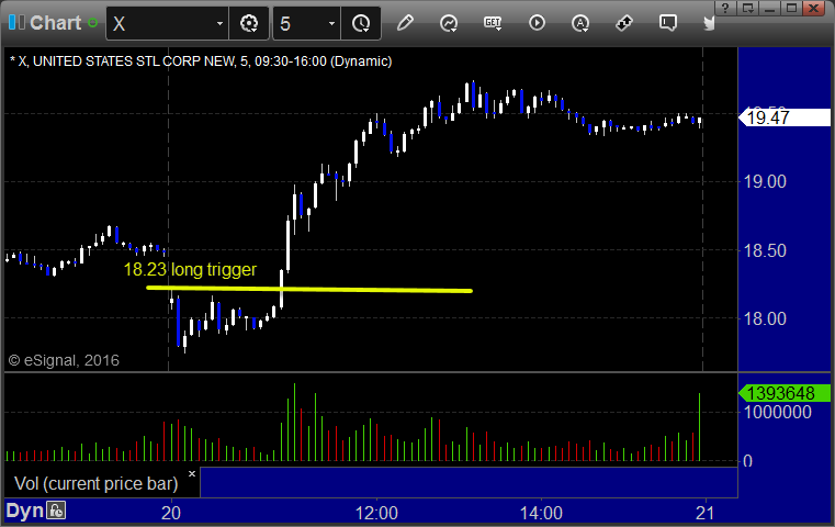 From the Messenger/Tradesight_st Twitter Feed, Rich's X triggered long (without market support, although it's a steel stock) and worked great:
