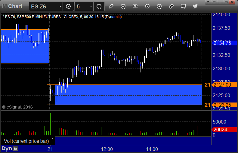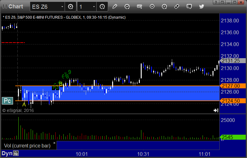 ES Opening Range Play triggered short at A and stopped, triggered long at B and after 40 minutes I closed it (right before it ran) for a tick:
