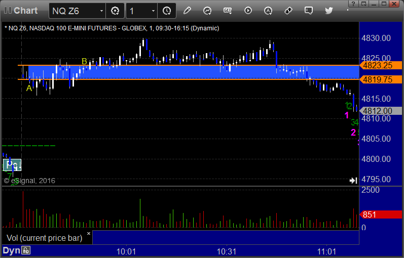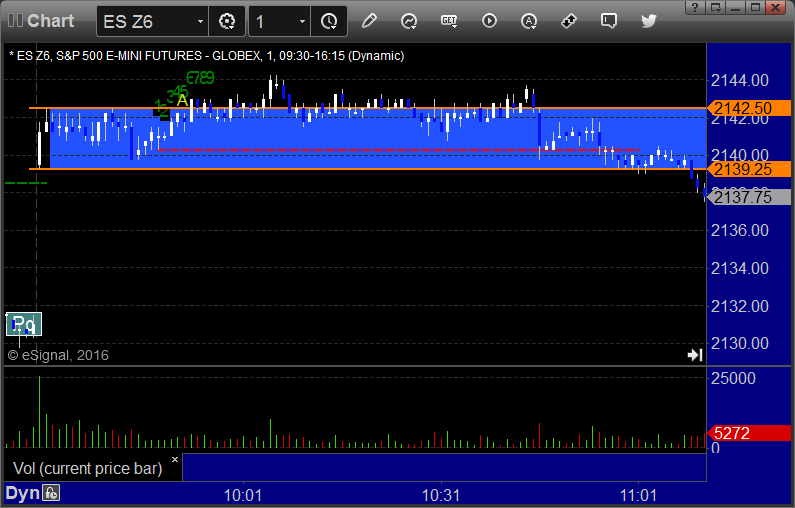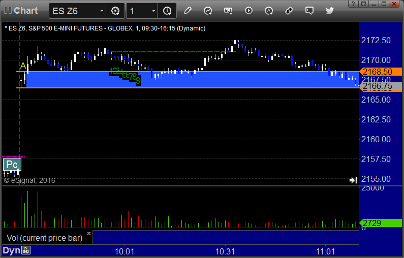 ES Opening Range Play triggered long and A and stopped, triggered short at B and after almost an hour I closed it for a tick loss: