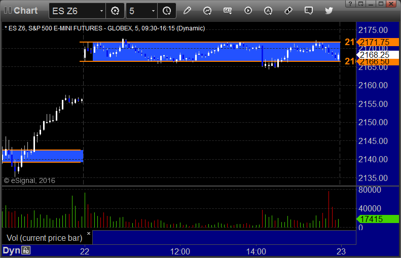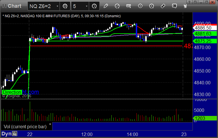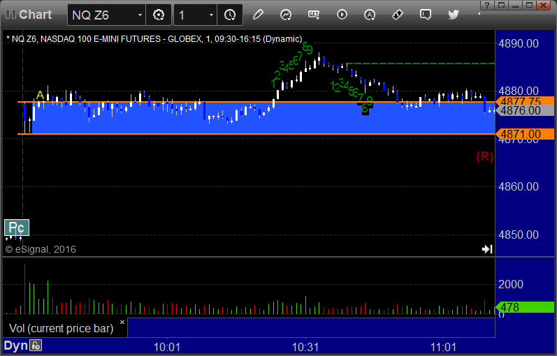 I was hoping for the better day of the week and instead got the flattest day of the week. Markets gapped up and literally sat dead flat in 1/3rd of average daily range on both futures. Somehow, we managed to pull off winners in the Opening Range plays (see that section below) but that was about it. NASDAQ volume was 1.75 billion, but it sure didn't move much.
