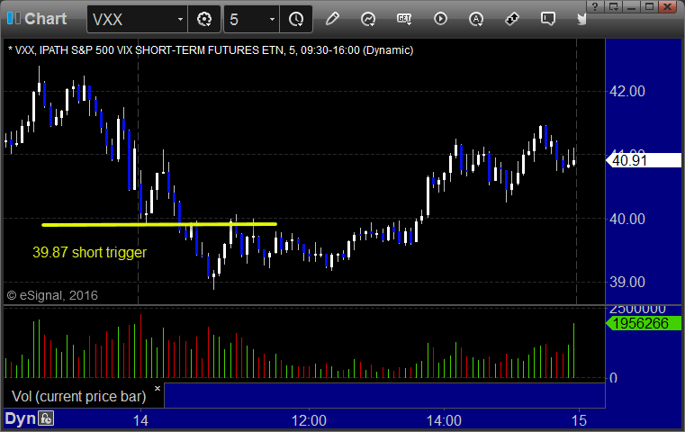 His VXX triggered short (ETF, so no market support needed) and worked: